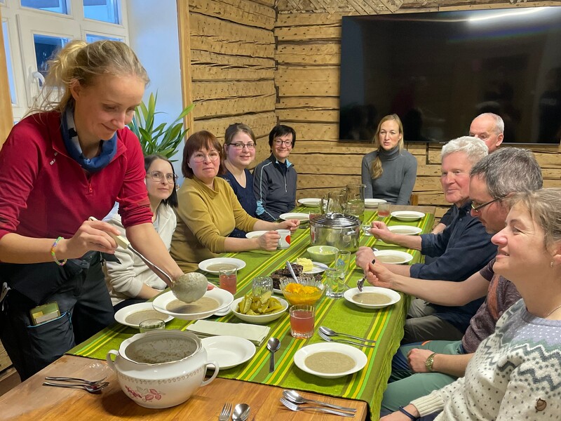 Am besten hat mir jedoch die Wanderung im Moor gefallen. Eine einmalig schöne Landschaft, die ich so noch nie zuvor erlebt habe. Die täglichen Yoga-Einheiten mit Mariia waren sehr inspirierend, haben uns alle begeistert und sehr viel Spaß gemacht. Aber auch der spontane Besuch der großen Malamuts, das Kicksledding und der Kochkurs waren fantastisch. Das altehrwürdige Landhotel hatte seinen ganz eigenen wunderbaren Charme im tiefverschneiten Laheema-Nationalpark und es hat sehr gut in die Geschichte Estlands, die uns Triin so gut vermittelt hat, gepasst. Es war einfach herrlich, die Abende im SPA-Bereich des Hotels ausklingen zu lassen. Marie (Februar 2024)