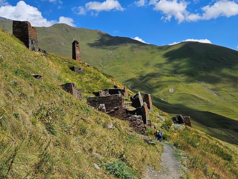 Mit dem Geländewagen gelangen Sie nach Schatili. Schatili ist von einem Dutzend Familien bewohnt, aber im Winter nicht erreichbar. Das historische Dorf liegt in der tief eingeschnittenen Arghuni-Schlucht auf 1.400 Meter Höhe und bewachte mit seinen 60 Türmen die nordöstlichste Ecke des Landes. Weiter geht es nach Mutso, dessen Ruinen spektakulär auf einem Felsen thronen. Danach wandern Sie entlang des Ardoti-Tals bis zu Ihrem Camp bei Ardoti (1.790 m).
