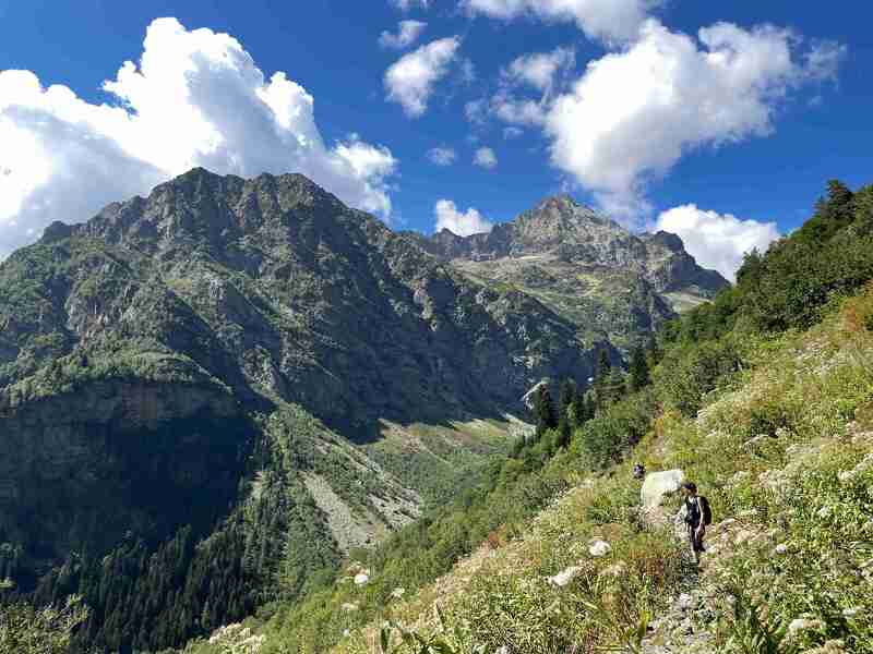 Nach einem kurzen Transfer nach Etseri beginnt Ihre Wanderung durch Wiesen und Wälder, bevor der Weg steiler wird. Oben am Mazeri-Pass liegt die Bergwelt weit vor Ihnen: die Gipfel der Region, der Gletscher am Uschba und die abgelegenen Täler wirken hier besonders nah. Beim Abstieg begegnen Ihnen Hirtenhäuser und Bergwiesen, die den Wechsel zwischen alpiner Höhe und Tallandschaft gut spürbar machen. Der Weg führt zurück zum Fluss Dolra, den Sie überqueren, bevor Sie wieder Betscho erreichen.