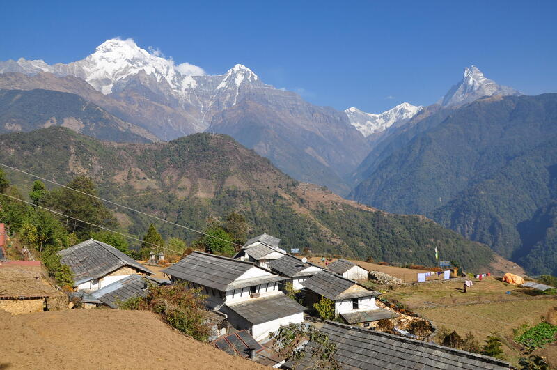 Zum Sonnenaufgang genießen Sie von Tadapani den Blick auf Annapurna Süd, Hiunchuli, Gangapurna und Machhapuchhare. Danach steigen Sie teils steil, teils gemütlich hinab ins Gurung-Dorf Ghandruk (1.980 m) und weiter zum Fluss Modi Khola (1.330 m). Die hier lebenden Gurung sind ein nepalesisches Volk mit tibetischer Abstammung. Sie leben traditionell von Viehzucht, Handel und Landwirtschaft. Anschließend führt der Weg hinauf nach Landruk (1.700 m), ein weiteres malerisches Bergdorf der Gurung.