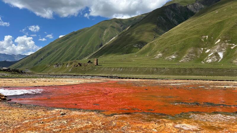 Die Landschaft des Truso-Tals ist geprägt von bunten Travertinterrassen, die durch kalkhaltige Quellen entstehen. Gelb bis rostrot gefärbte Kalkablagerungen formen Terrassen und Becken, die in Georgien nur an wenigen Orten vorkommen. Im Kontrast zur grünen Umgebung wirkt die Szenerie fast surreal. Ihr Ziel ist das Dorf Ketrisi, das nur in den warmen Monaten von Hirten und ihren Herden bewohnt wird. Ein Geländewagen bringt Sie zurück nach Stepantsminda, wo der Tag beim Abendessen ausklingt.