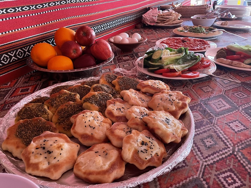 Yoga, Frühstücken, Seele baumeln lassen, Wandern, Entspannen: Freuen Sie sich auch heute auf den fast schon zur Routine gewordenen Vormittag. Nach dem Mittagessen fahren Sie in das Dorf des Alzalabieh-Stammes. Hier lernen Sie mehr über das Leben der nun sesshaften Beduinen und über ihre Geschichte. Gemeinsam mit einer beduinischen Familie backen Sie traditionelles Brot. Danach erfolgt die Rückfahrt, bevor der Tag mit einem Abendessen im Camp endet.