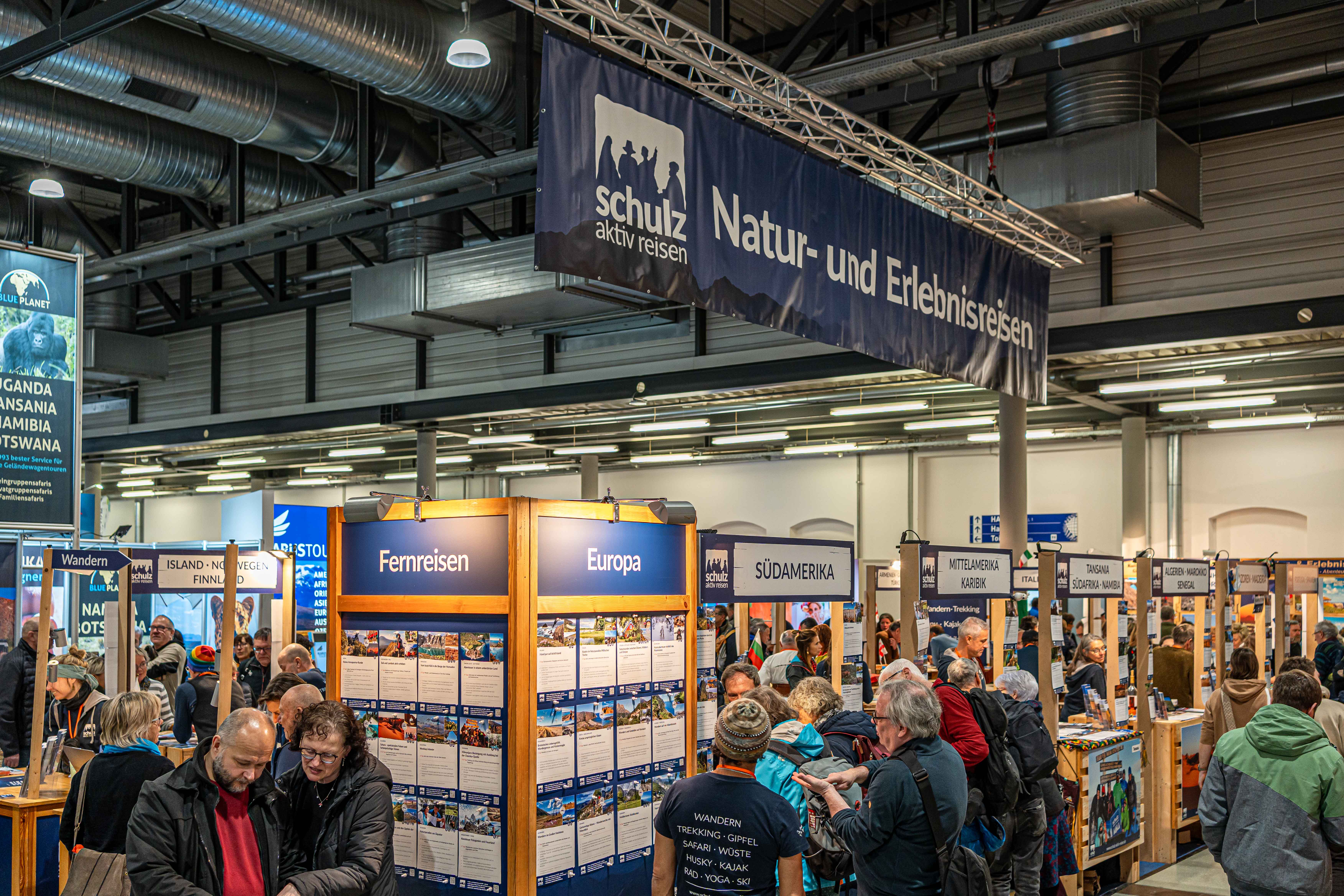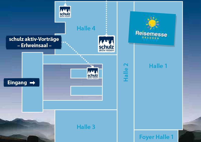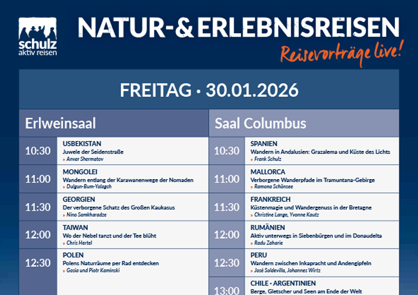 Schon am Mittwoch, zwei Tage vor Messebeginn, findet der Auftakt der Reisetage in unserer Reise-Kneipe statt. Am Freitag öffnen sich dann die Messetore: In unserem schulz aktiv-Bereich erwarten Sie 18 Länderstände, an denen Reiseleiter, Agenturpartner und unser Team Sie mit auf Ihre nächste Reise nehmen – sei es in Gedanken oder ganz konkret mit einer Beratung bis hin zur Buchung. Im Erlwein- und Columbussaal können Sie täglich von 10 bis 18 Uhr unseren Reisevorträgen lauschen und sich mit uns in nahe und ferne Welten fallen lassen.